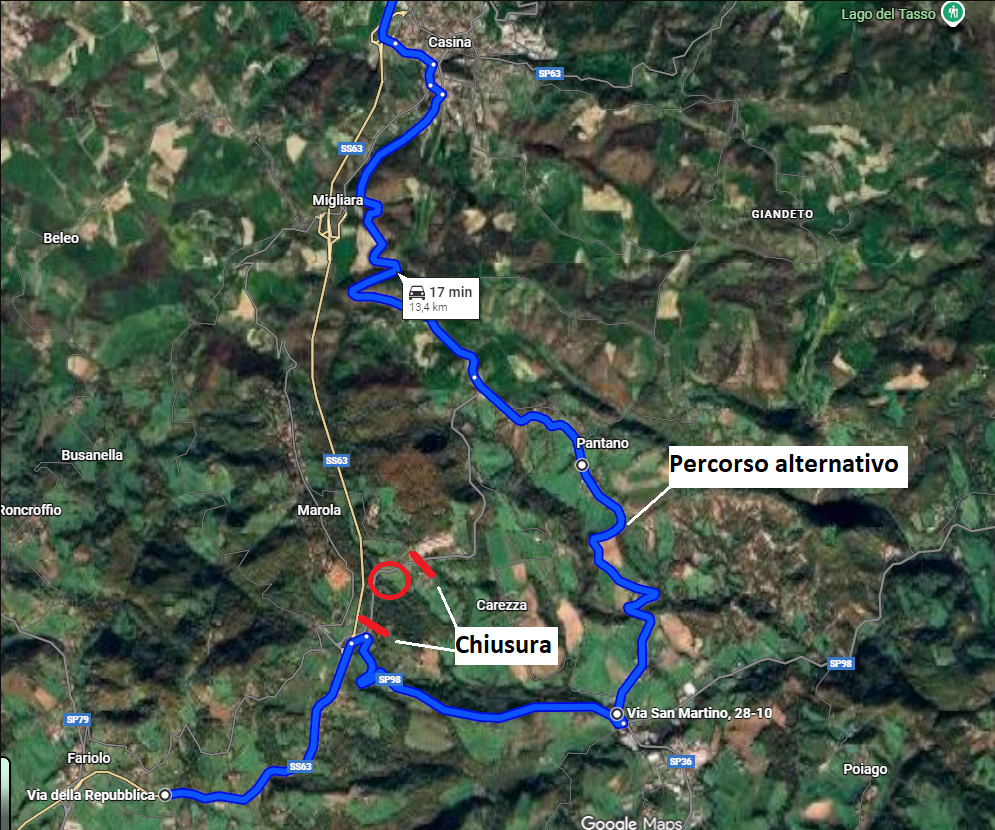 Il traffico in direzione Casina – Castelnovo ne’ Monti sarà deviato su via San Martino (località Cigarello).